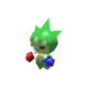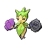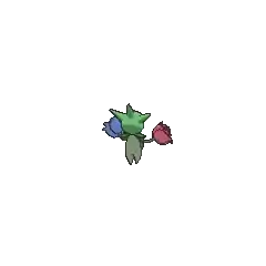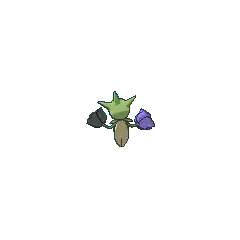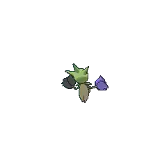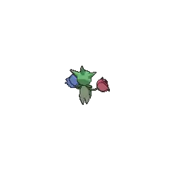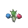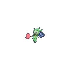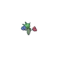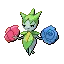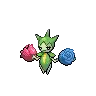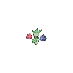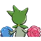 Roselia is a small, light green bipedal Pokémon. It has three thorns on top of its head, and it has black eyes with long eyelashes. Visible from the back is a small stretch of yellow coloration around its neck much like a collar. There are leaves extending from its shoulders like epaulettes. It has a leaf skirt with a yellow stripe running down the front. A male will have a shorter leaf than a female. It holds a rose in each of its hands, a red one in its right, and a blue one in its left. However, it is said that it will occasionally have unusually colored flowers.