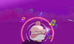 Swoobat opens its mouth and releases a high-pitched note from its mouth, causing red, green or blue sound waves to come out of its mouth. The opponent then holds its ears in pain. As the sound waves fly towards the opponent, they grow bigger. The attack is much more powerful when used in a group. | ||