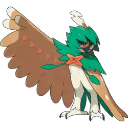 A nocturnal Pokémon, it stores energy during the day through photosynthesis. It approaches opponents by silently gliding, before unleashing a volley of kicks. This Pokémon is able to rotate its head almost 180 degrees and has excellent night vision.[1] Its feathers are as sharp as blades, which it launches at foes from the air. Rowlet feel most relaxed in tight, dark spaces.