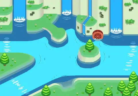 Rub-a-Dub River is a river that has three paths to it. It looks like it is used for irrigation, as there is a water wheel attached to some sort of building. The building has four waterfalls coming down the sides of them. At the center of the river is a small island with a tree.
