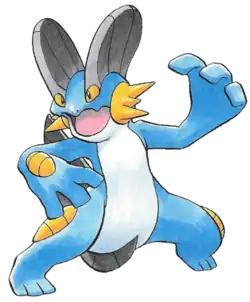 Mumu (Japanese: ZUZU) was first used by Ruby as a Mudkip to defend himself from an angry Sapphire. After the misunderstanding had been cleared, Ruby kept Mumu on his team and used him in Contests. During Ruby's quest, Mumu eventually evolved into a Marshtomp in Tripped Up by Torkoal and a Swampert in Master Class with Masquerain. He is used in Tough Contests. His Contest call is, "Regardless of the effects of time, the toughness that this body encompasses never changes. Boiling with raging Torrent, this is the Pokémon Swampert—Mumu!" With Ruby's Mega Bracelet, Mumu can Mega Evolve into a Mega Swampert. He is level 71, has a Relaxed nature, and his Characteristic is "likes to relax." | ||
