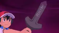 The Rusted Sword appeared in a flashback in The Champion, under the possession of Victor. When he held it up during his and Hop's battle against Eternatus at the Tower Summit, it summoned Zacian to their aid and allowed it to transform into its Crowned Sword form.