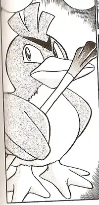 Farfetch'd is a master swordsman who had the ability to cut anything and it was super quick, as Shu and Pikachu had trouble keeping up with its speed. During the battle, Pikachu was able to defeat it using a technique Shu came up known as the Thunder Sword. None of Farfetch'd's moves are known. | ||