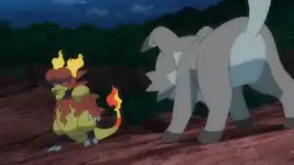 Magmar celebrates its victory before being challenged by a Pangoro. All of this makes Ash, Rotom, and Professor Kukui wonder why Rockruff is coming here. Later, Rockruff is heading home when it comes across Ash and Professor Kukui and greets them happily. Ash tells Rockruff that it was amazing taking on all of those strong Pokémon and offers to do some training with it so it can learn a new move. Rockruff agrees to this, and Pikachu agrees to help. The next day, down on the beach, Professor Kukui guesses that Rockruff was attempting to learn Rock Throw. Ash starts telling Rockruff to concentrate its power and starts making a few moves, which Pikachu imitates and powers up an Electro Ball. Ash and Pikachu start doing a few exercises on the beach and Rockruff watches Pikachu's movements. Later, Kiawe has Turtonator use Flamethrower on Pikachu which Pikachu dodges. Ash tells Rockruff that that's all it has to do when attacked with Flamethrower.