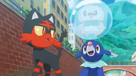 In the forest, Popplio is running and bouncing Rowlet on its nose as Meowth and Mareanie follow. Back at Bewear's den, Jessie and James recover and prepare to go after Meowth and Mareanie only for Bewear to stop them. Popplio and Rowlet are still on the run when Popplio trips on a rock causing Rowlet to bounce off and send them flying off the hill. They are then confronted by Meowth and Mareanie, and Meowth has Mareanie attack them, only to be burnt by an Ember attack as Litten appears on the scene. Litten confronts Meowth who goes to hit Litten with Fury Swipes which Litten counters with its own Fury Swipes, knocking Meowth out. Popplio, Rowlet, and Litten then head off, with Rowlet now in a balloon that Popplio had made. Litten leads Rowlet and Popplio to the city and under a bridge by the river which it has made its home with Stoutland. After a brief recap of the previous time Litten and Stoutland had been encountered, Litten takes Rowlet to Stoutland and pops the balloon it is in as Stoutland comes off the couch. Rowlet is nervous as Stoutland approaches and sniffs it as Litten and a nervous Popplio look on. Stoutland gives Rowlet a lick and recognizes it as belonging to Ash. Popplio wonders what they will do now and explains that they need to get back to their Trainers and that the ring around Rowlet's neck is preventing it from flying. Stoutland then instructs Litten to return Popplio and Rowlet to their Trainers. Litten isn't too happy about having to do this but eventually agrees to take Popplio and Rowlet.