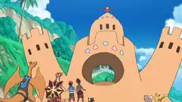 Pikachu launches a Thunderbolt on Palossand but Ash stops him. Ash tries to climb Palossand's wall but the sand creates difficulty but he soon makes it. Reaching the window, he tells Kiawe they need to find that shovel and fast. Lana, Mallow, Lillie, and Sophocles arrive and spot Palossand. Rockruff goes to attack Palossand but Palossand goes to eat Rockruff, Litten kicks Rockruff out of the way, resulting in Litten getting eaten instead. Litten ends up inside Palossand's body with Ash. Ash drops down to the floor to pick Litten up as Litten and Rotom start to glow green. Kiawe fills the others in on what has happened. Ash tells them that Litten is glowing green. Lillie guesses from her reading that Palossand is absorbing their energy in order to maintain its giant size as Ash tries to throw Litten out but a force sends Litten back in. Lana has Popplio attack Palossand, only for Water Compaction to activate, healing the damage and making it tougher.