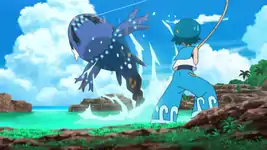Popplio, now back in action, continues its battle with the Totem Pokémon. After racing in front of the Totem Pokémon across the lake, Popplio manages to defeat the Wishiwashi with its newly-learned Aqua Jet, managing to break up the school of Wishiwashi. The Solo Form Wishiwashi flees, and the Wishiwashi that Lana had helped before then appears out of the water. In its mouth is a Waterium Z, which it hands over to Lana.
