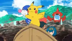 Back at Brooklet Hill, Ash and Lana's boat is being pulled across the lake by the large Wishiwashi at the end of Lana's fishing rod. The boat then collides with an island in the middle of the lake, and while Lana manages to land properly, Ash and Pikachu are sent flying into the lake. Seeing Wishiwashi approaching them, Ash manages to quickly jump onto the island but Pikachu remains floundering in the water. At Lana's command, Popplio manages to save Pikachu from the Wishiwashi in time.