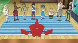 After deciding where everyone sleeps, everyone decides to play another game. Rotom Pokédex has a slot machine function, and after every spin, the icons indicate which Z-Move pose to act out. The game continues with players losing if they fail to make the correct poses, or fail to say the name of the Z-Move in case all the shown symbols are the same. The game soon ends when Kiawe and Turtonator accidentally unleash Inferno Overdrive. After cleaning up, Professor Burnet starts on dinner with Lillie, Ash, and Mallow helping out. After the room has been tidied up, the others decide to watch TV, but start arguing over what to watch before deciding on Pokémon Base. Dinner is soon ready, but before anyone can even react, Burnet's Munchlax eats all of it. Whilst Professor Kukui and Professor Burnet are out getting more food, Ash and friends head out to do some training on the beach.