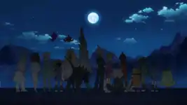 The class figures the "emissaries of the sun and the moon" were Solgaleo and Lunala, and the "end of the sky" is the other side of an Ultra Wormhole. Kiawe wonders if the Blinding One is still on the other side of the Ultra Wormhole, and Lillie believes that it is. Poipole looks up at the sky to see dark clouds. Then, Komala rings the bell to announce lunchtime. After realizing his mother didn't make him lunch, Sophocles becomes depressed, but the class and their Pokémon share their food with Sophocles. Meanwhile, at Team Rocket's food truck, Meowth is excited about the eclipse, but Jessie and James aren't interested and feeling cold. Then, Meowth looks out to see people lazing around, including Nurse Joy and Officer Jenny. Mallow and Tsareena return home, but finds the place empty. Abe is revealed to have gone to Oranguru's place, along with several other tired adults. Meanwhile, at the beach, Ash and Kiawe try to practice their Z-Moves, but the moves fade away. Ash and Kiawe wonder what happened, and Rotom reveals that neither Pikachu nor Marowak were able to build up Z-Power. After Ash wonders if the clouds have anything to do with it, Poipole draws a symbol, the Prism Star, on the ground.
