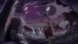 Upon arrival, Mismagius carries the carefree twins away while a group of Gourgeist blocks anyone from intervening. Pikachu uses Thunderbolt on the Gourgeist, and the wild Pokémon return to being pumpkins. Following Acerola's suggestion, Mimikins leads the group to a nearby mausoleum. As Ash and his friends make their way down, the stairs crumble under their feet and they drop down into another area. Lana soon spots her sisters who are enjoying soaring through the sky with their Ghost-type friends and their new sets of Vivillon and Beautifly wings. Lana's stern commands are once again ignored, and Mismagius warps everyone into another illusion.