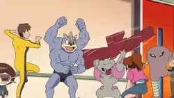 - The man surrounded by Fighting-type Pokémon and wearing a yellow jumpsuit is a reference to actor Bruce Lee and the jumpsuit he wore in the incomplete martial arts film Game of Death.