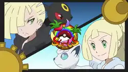 Caster announces the next battle between Gladion and Lillie. Lillie has Snowy summon Hail, instantly changing the battle conditions to suit Snowy's Ice type. Gladion quickly orders Umbreon to attack with Dark Pulse, though Snowy is uninjured as she hides amongst the growing frost. Gladion is mildly impressed by Snowy's Snow Cloak Ability, admitting that Lillie is growing as a Trainer. He orders Umbreon to use Shadow Ball, which smashes through Snowy's Aurora Veil and strikes its target. As the Hail conditions fade, Lillie decides to use her Z-Move, and Snowy successfully lashes Umbreon with Subzero Slammer. Umbreon, however, is mostly unscathed and knocks Snowy out with a super-effective Iron Tail. As Lillie comforts Snowy in her arms, Hapu declares Gladion is the winner. Despite the outcome, Lusamine expresses pride in her children, admitting that she wished her husband Mohn could be there to watch.
