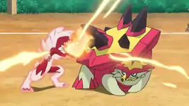 As his semifinals match against Gladion approaches, Kiawe takes on Ash in a training battle. Kiawe's Turtonator strikes Torracat with Dragon Tail, while Torracat responds with Revenge that pushes Turtonator back. The boys end their training session after Torracat's Fire Blast collides with Turtonator's Flamethrower. Later, the group goes to the docks to meet up with Kiawe's sister Mimo, but find she is nowhere in sight. Sophocles, having spoken to the concierge, informs Kiawe that the boat arrived 30 minutes earlier. Kiawe rushes over to the Manalo Stadium, suspecting Mimo went there.