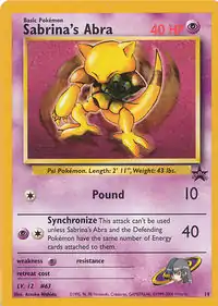Sabrina's Abra (Japanese: ナツメのケーシィ Natsume's Casey) is a Psychic-type Basic Pokémon card. It was first released as part of the Gym Challenge expansion.