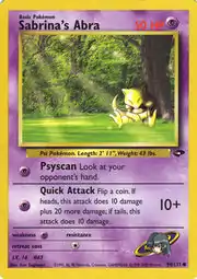 Sabrina's Abra (Japanese: ナツメのケーシィ Natsume's Casey) is a Psychic-type Basic Pokémon card. It is part of the Gym Challenge expansion.