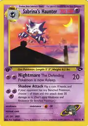 Sabrina's Haunter (Japanese: ナツメのゴースト Natsume's Ghost) is a Psychic-type Stage 1 Pokémon card. It is part of the Gym Challenge expansion.