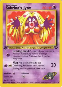 Sabrina's Jynx (Japanese: ナツメのルージュラ Natsume's Rougela) is a Psychic-type Basic Pokémon card. It is part of the Gym Challenge expansion.
