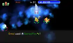 In Red Rescue Team and Blue Rescue Team, Sacred Fire is a move with 20 base power, 88% accuracy, and 10 PP. It damages an enemy in front of the user, and might possibly inflict a burn on them.