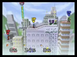 Saffron City appears as a playable stage, specifically the roof of Silph Co., in Super Smash Bros. In the background, the text "Gotta Catch 'em All!" and "Route 5" can be seen. A mountain range in the background may be the same one that contains Mt. Moon, Victory Road, Cerulean Cave, and Mt. Silver. There is also a minor building with some blurry text that seems to start with "F", so it could possibly be the Fighting Dojo.