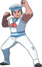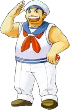 A Sailor (Japanese: ふなのり Sailor) is a type of Pokémon Trainer that debuted in the Generation I games. Originally they were often depicted as burly men in sailor suits flexing their muscles, though their actual physical shape varies between games. The sailor is one of two minor trainer classes, the other being Guitarist, whose design features a visible tattoo. The Generation I sprites have an anchor tattoo and the Pokémon XD model has “FeeL GooD” tattooed across the knuckles reminiscent of “Hold Fast” tattoos. In Pokémon Diamond, Pearl, and Platinum, a sailor named Eldritch plays a minor part in the game's storyline.