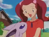 Espeon first appeared as a lost Eevee that ran into Ash and his friends. The Eevee's owner, Sakura, approached the group and Misty returned Eevee to her. Sakura invited the group to a tea-ceremony that Sakura's sisters, the Kimono Sisters, were hosting. Team Rocket was also at the event and attempted to steal the Sisters' Pokémon. Sakura sent out her Eevee to battle them, and it was revealed that Eevee was the only unevolved Pokémon owned by one of the Kimono Sisters, in a similar situation to a previous episode. During its battle with Arbok, Eevee became injured after Arbok defeated it, leaving the protagonists to finish the trio off instead. Later, while Misty and Sakura were discussing about their sisters, Eevee was seen happily playing with Togepi. When Team Rocket came back to steal the Pokémon once again, Sakura sent out Eevee to take on Victreebel. Unfortunately, it was beaten once again. Victreebel then threw Eevee into Team Rocket's Pokémon cages. Eevee was freed by Tamao's Umbreon and Team Rocket's plan of stealing the Eeveelutions backfired. When Ash and his friends left for Olivine City, Eevee and Sakura waved goodbye to them.