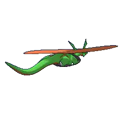 As Mega Salamence, its wings meld together into a single huge, crescent-shaped wing. According to the anime, the hard, yet very flexible properties of its wings allow them to be used as blades in mid-air battles. Its face, neck, body and tail are narrower, and its tail is noticeably shorter in length. The ridges above its eyes are now far less prominent, and it no longer possesses the thick, gray scaling over its lower jaw. Instead, the smooth red flesh underneath has been left exposed, increasing its streamline appearance. The upper pair of fins resting on the sides of its head are now elongated and tapered. The lower pair has not changed much. However, the middle set now take the form of quarter-arches, spanning towards the bridge of the nose. The remnants of its shelled underbelly have been drastically transformed into a segmented, more aerodynamic, vest-like armored frame. This frame encases its chest and shoulders with the pieces interlocking whenever Mega Salamence tucks in its front forelegs.