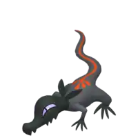 Salandit is a small, black Pokémon resembling a salamander or lizard. Its body is dark gray with a black head and feet. Along its back and down its tail is an orange-red line. This marking splits into four short lines with round tips at the base of its tail. At the base of its neck are two short, flat spines, which create the impression of a mask or bandanna tied around its head. Its eyes are light purple with slit pupils and there are several tooth-like protrusions along its upper jaw. Each foot has four pointed toes.