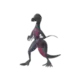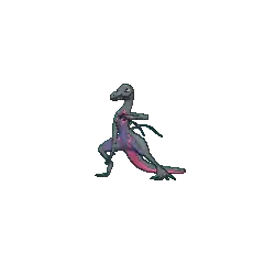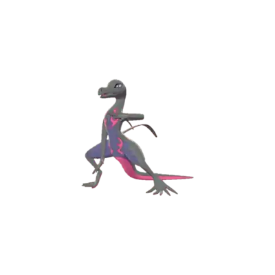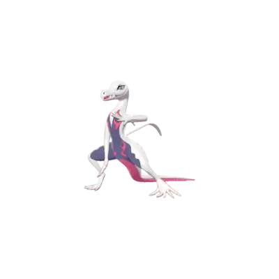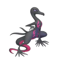 Salazzle is a dark gray Pokémon resembling a salamander or lizard. Its thin body has a purple underside with several wavy, dark pink markings: a U-shaped marking with two additional lines inside on its chest and one on each hip resembling wisps of smoke. The dark gray on its head and neck extends slightly onto its chest in a V-shape. It has a slender head with purple, almond-shaped eyes with slit pupils and two fang-like projections on each side of its lower jaw. There are two thin, wavy growths on its back at the base of its tail, which is whip-like with a dark pink underside. Its hands and feet each have five long, thin digits. Salazzle is a female-only species with no known male counterpart.