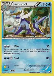 Samurott (Japanese: ダイケンキ Daikenki) is a Water-type Stage 2 Pokémon card. It was first released as part of the Black & White expansion.