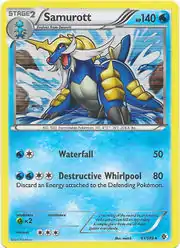 Waterfall is a move in the Pokémon games that Samurott can learn. Destructive Whirlpool is an attack originating from Gym Heroes Misty's Poliwhirl as Rapids. This card's Pokédex entry comes from Pokémon Black.