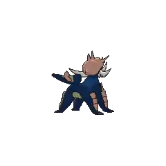 Hisuian Samurott is a rare form of Samurott born from the influences of the Hisui region. The shell on its head has two additional spikes on its sides, and it has a wavy protrusion at the front. Its whiskers are also wavy, with the bottom part being much longer than Unovan Samurott's whiskers. The shells covering its head and legs have sharper edges and are black with red accents. There is one less layer of shell covering its hind legs compared to Unovan Samurott. The innermost section of its tail is longer and colored black, while its claws are red.