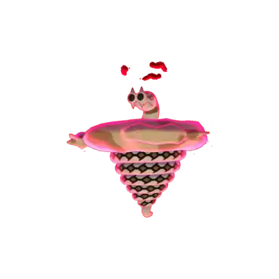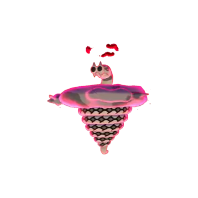 As Gigantamax Sandaconda, it becomes larger and standing on its tail like a cobra. The body, decorated by brown and black diamond markings, has coiled around with the head and neck in middle to resemble that of a tornado. The neck pouch enlarges and becomes a swirling mass of mottled brown sand. Three red clouds float above its head and its eye color changes to bright red.