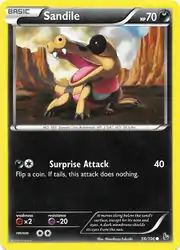 Sandile (Japanese: メグロコ Meguroco) is a Darkness-type Basic Pokémon card. It is part of the Flashfire expansion.