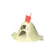 Sandygast is a Pokémon formed from sand. It is mostly a mound of whitish sand dotted with gray pebbles. A tunnel through its center acts as a mouth, and a small depression above that has two pebbles for eyes. A red shovel with a white handle is stuck blade first into the top of its head. On either side of its main body is a smaller mound reminiscent of a stubby arm.