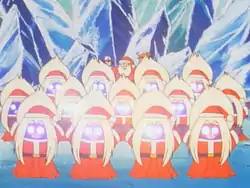 When Ash and his friends arrived at the North Pole thanks to a Lapras, Team Rocket had captured all the Jynx at the North Pole as well as Santa Claus. When Jessie confronted the Jynx who stole her doll, it was revealed that the Pokémon was simply trying to repair the doll, which had been broken. The rest of the Jynx took the presents back from Team Rocket and then used Psywave, sending them blasting off. The Jynx is later seen giving Ash and his friends presents. It is last seen putting Team Rocket asleep with a Lovely Kiss. The Jynx's only collectively known move is Psywave, but at least one also knows Lovely Kiss. | ||