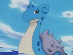 | Santa Claus's Lapras first appeared when Ash was trying to pull a raft for Jynx to get home. Ash heard a voice, and a large wave pulled him underwater. Lapras appeared to him, and using its telepathic powers, revealed that it was sent by Santa to return the Jynx to the North Pole. After helping Ash and the others there, Team Rocket appeared and fired a net over Lapras and the group.