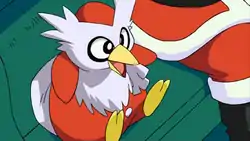 When Delibird first woke up, it was very angry, but Pikachu and Togepi calmed it down. Delibird then realized all of its presents were gone. Pikachu and friends volunteered to help Delibird find the missing presents. They divided into two teams and split up to search the entire city. Sunset soon came, and the two teams reunited and gave Delibird all the presents. After recounting the presents, Delibird realized that one was still missing. With the sun already set, the Pokémon were forced to look for the present in the dark. They went to a park and looked for the last present. It was spotted in a tree by Ash's Noctowl, but it fell from its beak over a river. Just as it was about to fall in, an Aipom caught it and returned it to Delibird. All of the Pokémon were distracted by a tree lighting, and when they looked around, the Delivery Pokémon was gone. Then they heard bells jingling and looked up; to their surprise, Delibird was flying off in Santa's sleigh. The sleigh flew out of sight, and Delibird happily waved back to its newly made friends. None of Delibird's moves are known. | ||
