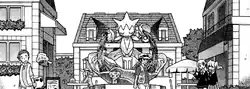 Santalune City first appeared in Kangaskhan...Kangascan't, where X and his friends arrived there. After having almost gotten caught by Team Flare in Aquacorde Town, Y presented the group with five rules to protect themselves, but she was interrupted by Shauna before she could say the fifth rule. Viola then showed up, introducing herself as the city's Gym Leader, and offered to help the group with their search for answers, as she was in Vaniville Town at the time of when Xerneas and Yveltal clashed there. While the rest of the group accepted the offer, Shauna, disgusted by her friends violating the rules Y had just presented for them, went off on her own. The others followed Viola to the Santalune Gym, where X agreed to a quick battle against her while Tierno and Trevor helped Y decipher some clues from the photos Viola took at Vaniville. Y then left to look for Shauna, and returned with her just as X won his battle against Viola.