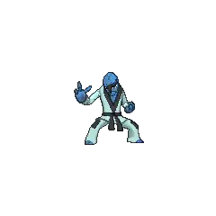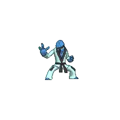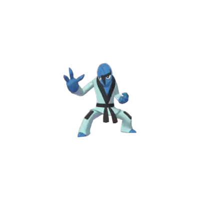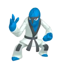 Sawk is a bipedal, humanoid Pokémon with a lean, blue body and rocky skin. Its head is oblong-like and low on its shoulders, with an ornate sideways z-shaped black feature that forms its nose and its left brow. Its hands and feet each have three digits, with its feet and toes coming to a sharp point. It wears a light blue karate gi with a black, v-neck collar that extends down to its black belt. Sawk will tie this black belt to increase its power. The gi has an intricate diamond pattern on its sleeves and a black, square patch on the bend of its knees.