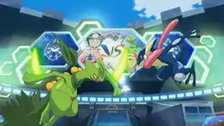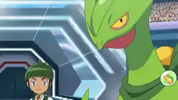 In A Towering Takeover!, Sawyer used Sceptile's Leaf Blade to help defend people against the giant roots attacking Lumiose City, soon joined by Shauna's Ivysaur, Tierno's Blastoise, and Trevor's Charizard. It was later seen at the Pokémon Center, helping the citizens of Lumiose City. It was also seen watching the battle against the Giant Rock unfold on television in Rocking Kalos Defenses! and Forming a More Perfect Union!.