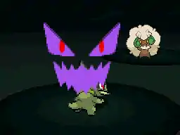 | Poochyena glares the opponent as red and black streaks of energy come out of its face. It then releases a red and black energy from its face at the opponent. As it travels, the energy morphs into a scary face that frightens the opponent. | |||