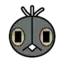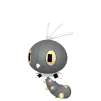 Scatterbug is a black larval Pokémon with a relatively large head. Its head is bisected by a line that runs from the forehead to the mouth. It has large beige eyes with square black pupils, a single pointed tooth that pokes out of its mouth, and three white hairs on top of its head. Scatterbug has a three-segmented body with a pair of nubby, beige legs on each segment. A white ruff of fur encircles its neck, and there is a large beige spot on its rear. If threatened by a bird Pokémon, Scatterbug can spew a paralytic black powder. The powder covering its body regulates its temperature, allowing it to adapt to any climate.