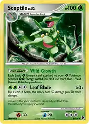 Wild Growth's Japanese name is an alternate wording of Overgrow, an Ability in the Pokémon games that Sceptile can have. Leaf Blade is a move that Sceptile can learn. This card's Pokédex entry comes from Pokémon Diamond and Pearl.