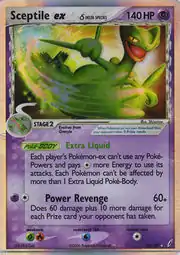 Sceptile ex δ (Japanese: ジュカインex δ Jukain ex δ) is a Psychic-type Stage 2 Pokémon-ex card. It is part of the EX Crystal Guardians expansion.