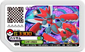 Scizor (Japanese: ハッサム Hassam) is a Grade 4 Pokémon Ga-Olé disk. It is part of the first Grand Rush set.