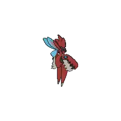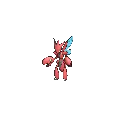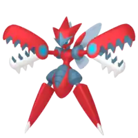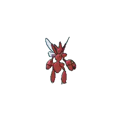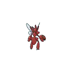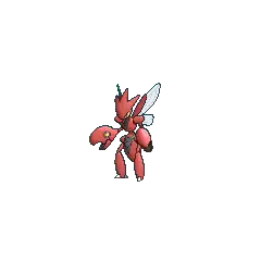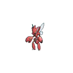 Scizor's body is as hard as steel, with claws strong enough to crush any hard object. They can be opened and closed like jaws, and are patterned with black, eyespots with yellow "pupils". Its muscles are said to be made of metal. It will raise its claws and wave them around to scare off predators or foes, giving it the appearance of having three heads. When it identifies an enemy, Scizor will use its claw to beat up the opponent to the point there is nothing but scrap left afterward. Scizor is incapable of flight, instead quickly flapping its wings to regulate its body temperature. It does this to prevent its body from becoming too hot and melting. It has tremendous power despite its slim body. Scizor is rarely found in the wild, though it can be found in grasslands.