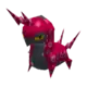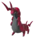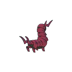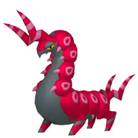 Scolipede is a centipede-like Pokémon that usually stands with the front half of its body raised vertically off the ground. Its segmented body is dark magenta, except for its smooth, dark gray underside. Long, slightly bent horns similar to antennae extend from its head, as well as an identical pair of horns on its rear. Purple bands decorate these horns, and teardrop-shaped rings of the same color mark each body segment, one on each side of its body. It possesses four pairs of short, purple fore-claws on the body segments that make up its neck, which is used to inject poison. The four hind legs are longer, thicker, and spaced farther apart. Each hind limb has curved dark gray bands around the middle.