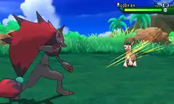 The end of one of Zorua's paws glows light blue and it swings the paw at the opponent, releasing a crescent blade of energy. | ||