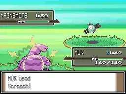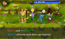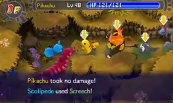 In Red Rescue Team and Blue Rescue Team, and Explorers of Time, Darkness and Sky, Screech is a move with 22 PP and 100% accuracy. It targets enemy in the front, while cutting corners, reducing their Defense stat to ¼ of the original value. This reduction is separate from the stat stages and can be applied multiple times, up to 1/128. This move is affected by Magic Coat, Taunt and Muzzled status condition. Being a sound-based move, it is blocked by Soundproof.